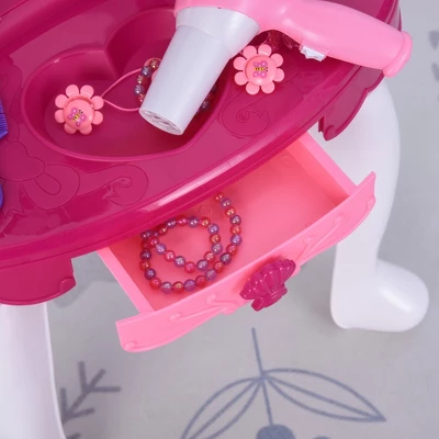 - Fashion Accessories: This makeup table for kids comes with a huge set of fashion accessories. The 26 pieces include a hair dryer, a butterfly comb, lipstick, makeup, nail polish, bracelets, rings, and more.