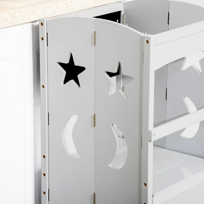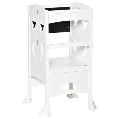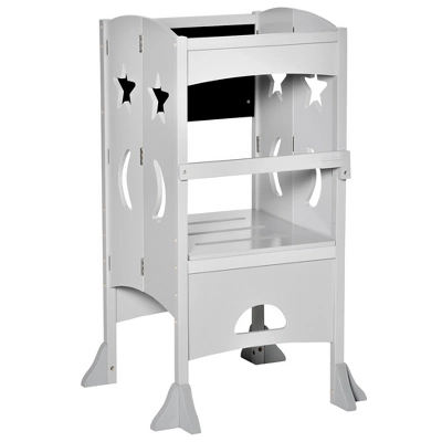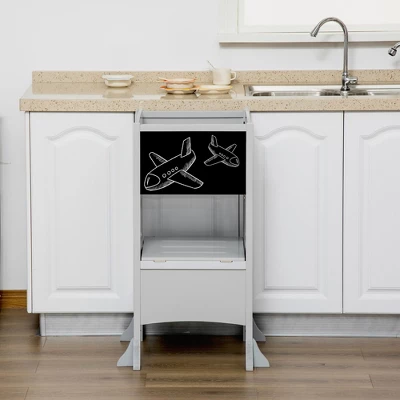 - Chalkboard: Featuring a chalkboard for drawing, this kitchen tower for toddlers has an activity integrated into its design. Let your child decorate their stool to make it more their own. The chalkboard is removable to allow the fun to be taken to a table.