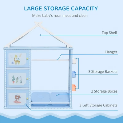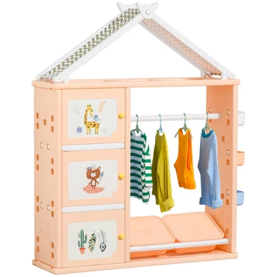 Merge hidden storage, a hanging rack, bins, and shelving with this Qaba closet for kids. The edges are rounded and polished to prevent harm and injury, and the bins are removable for easy access, featuring lids that keep the mess hidden. The design is roomy for an ever growing load of belongings, while featuring a top shelf and drop-in shelves for pencils, pens, and other small things. It’s never too early or too late to teach little ones how to tidy up their room.